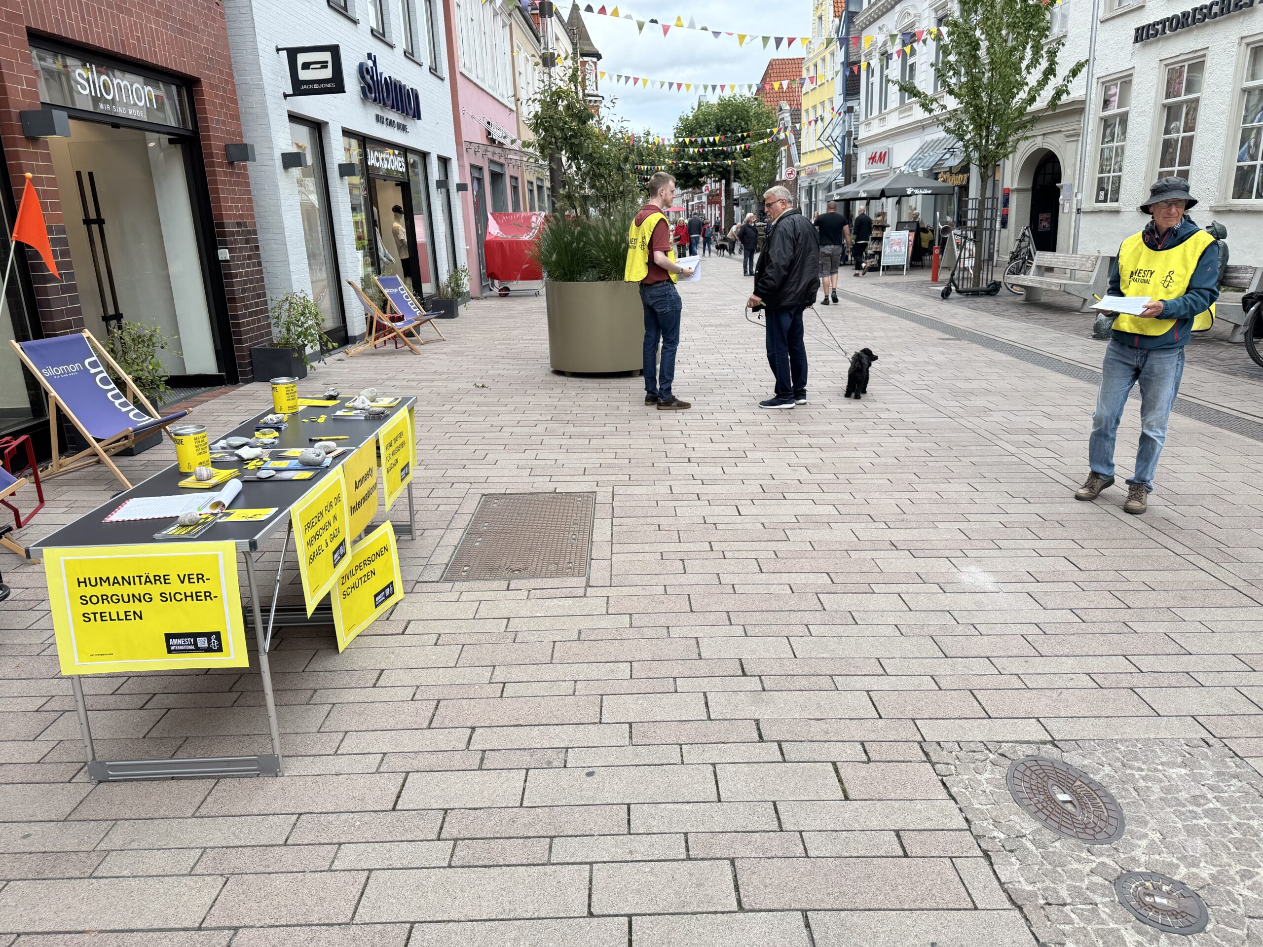22.8 2025 Informationsstand in der Innenstadt, Bewerbung des offenen Briefs an Kanzler Merz, daß er seinem Bekenntnis aus dem Koalitionsvertrag, zu Völkerrecht und Menschenrechten zu stehen, nachkommt. Viele Menschen unterzeichneten den offenen Brief mit den Forderungen an den Kanzler, daß er die Kriegsverbrechen des israelischen Militärs in Gaza klar benennt und dauerhaften Druck auf die Regierung Netanjahu in diesem Sinne ausübt.