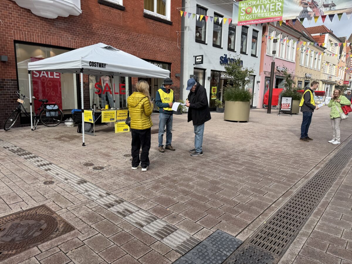 Am 21. Juni fand bundesweit der „Tag der offenen Gesellschaft“ statt. Auch in Aurich haben verschiedene Initiativen zum Gespräch in die Fußgängerzone in der Innenstadt eingeladen. Wir haben angeboten, mit allen Interessierten über Demokratie und Menschenrechte sowie – im Schatten des Weltflüchtlingstags der Vereinten Nationen am 20. Juni – über das Grundrecht auf Asyl und den Umgang mit Flüchtlingen hierzulande zu reden und zu diskutieren. Zudem haben wir die Möglichkeit angeboten, sich via Instagram mit verschiedenen Forderungen an die neue Bundesregierung zu wenden.