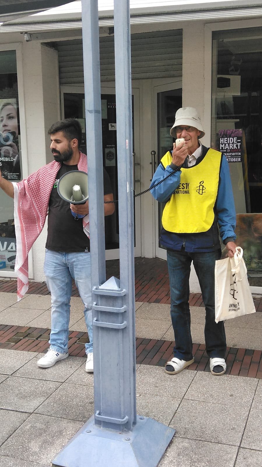 6.9.2025 Auf der von Palästinenser*innen initiierten Demonstration gegen den Genozid in Gaza in der Auricher Innenstadt hielten wir einen Redebeitrag und bewarben mit großem Erfolg den Brief an Kanzler Merz.