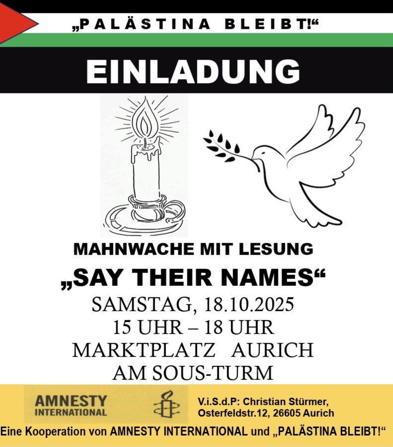 Am 18.10.2025 fand auf dem Auricher Marktplatz die Mahnwache für die vom 7.10.2023 an getöteten Kinder in Israel und Gaza statt. „Palästina bleibt!“ begann die Lesung mit den Namen der israelischen Kinder ( 2 Seiten ), dann folgte die Nennung der getöteten palästinensischen Kinder. Von der 400 Seiten starken Liste konnten in der dreistündigen Mahnwache nur 33 Seiten verlesen werden. Deutsche und Palästinenser wechselten sich ab.