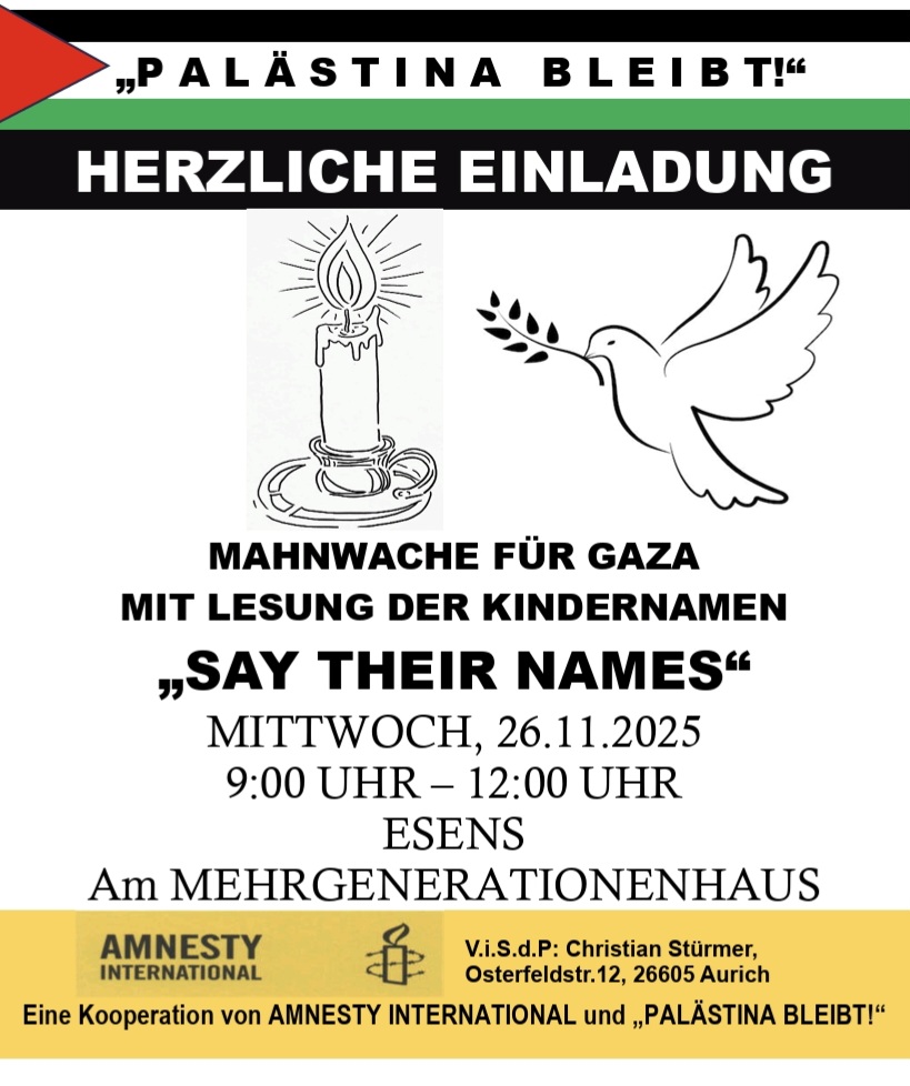 Zusammen mit Palästina bleibt! ruft Amnesty international zu einer ersten Mahnwache in Esens auf. Es sollen die Namen der israelischen und palästinensischen Kinder verlesen werden, die seit dem 7. Oktober 2023 getötet worden sind.