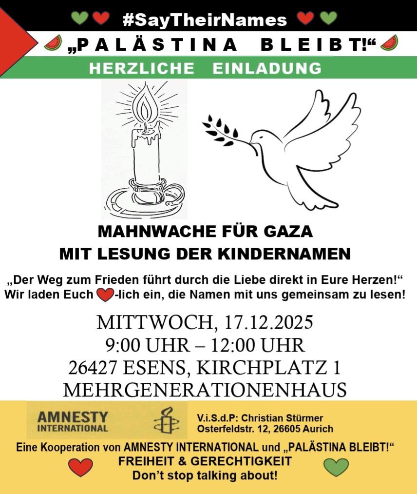 Amnesty international ruft gemeinsam mit der Initiative Palästina bleibt! zu einer weiteren Mahnwache in Esens auf unter dem Titel: „Say their names“.